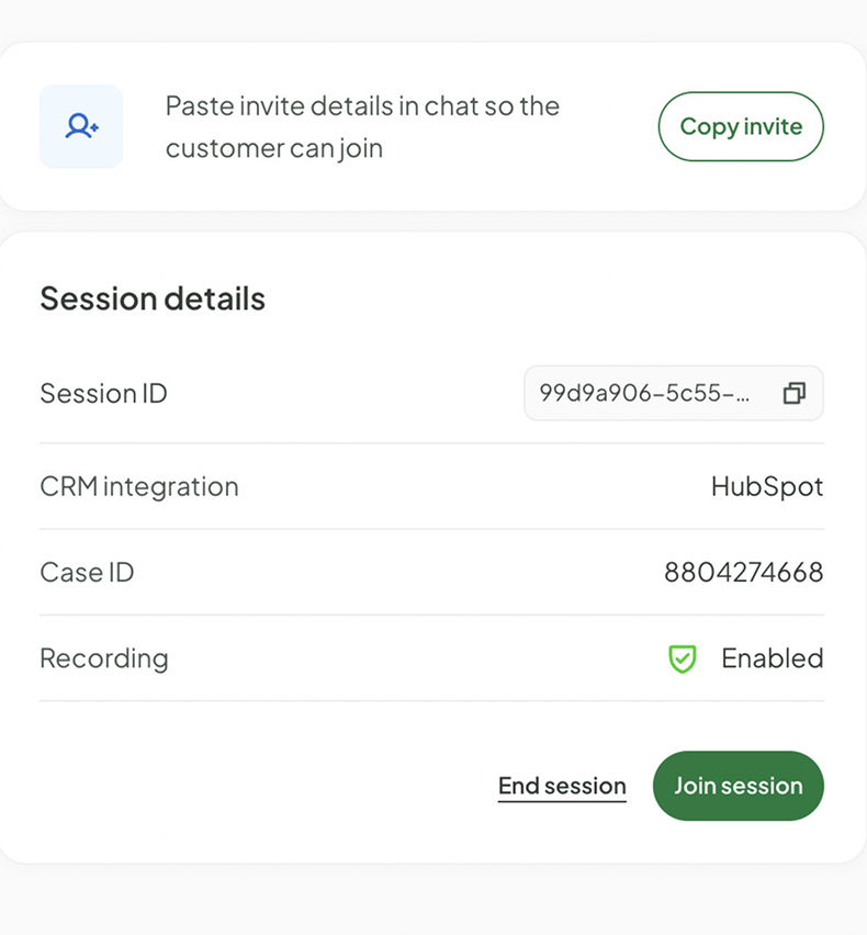 One-click screen sharing that lives inside HubSpot. No downloads, no separate meetings requests. Just instant visibility into customer issues.